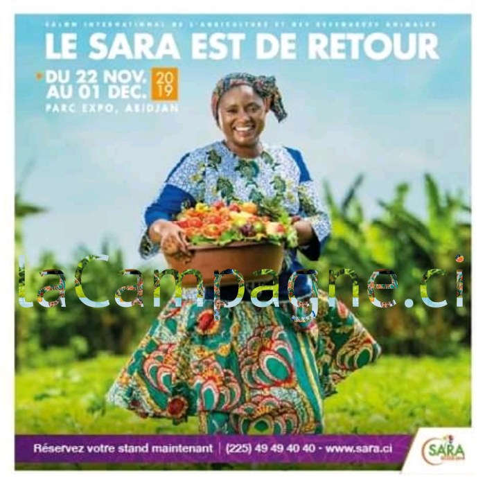 La 5ème édition du Salon International de l'Agriculture et des Ressources Animales (SARA), la plus belle vitrine d'exposition du savoir-faire agricole, de l'élevage, de l'industrie et de la pêche ivoirienne se déroulera du 22 Novembre au 1er Décembre 2019. Thème de cette année : Agriculture intelligente et Innovations technologiques, quelles perspectives pour l'agriculture africaine? La … Lire la suite Le SARA 2019 c’est pour bientôt !